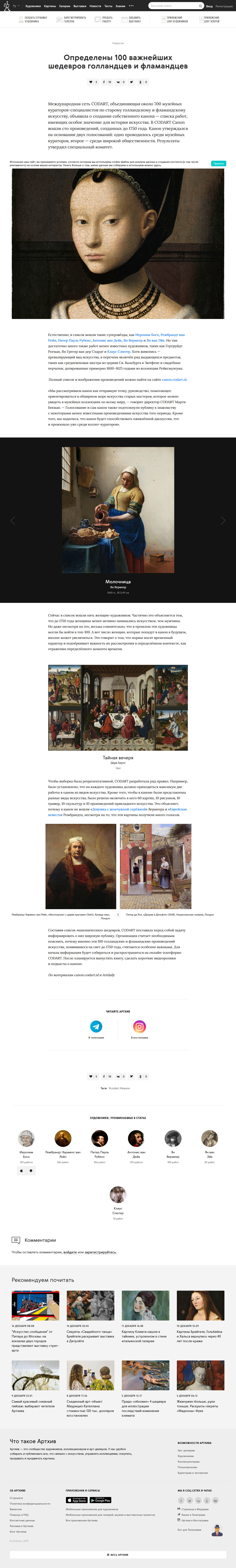 - ArtHive (artchive.ru), Определены 100 важнейших шедевров голландцев и фламандцев, 18 December 2019